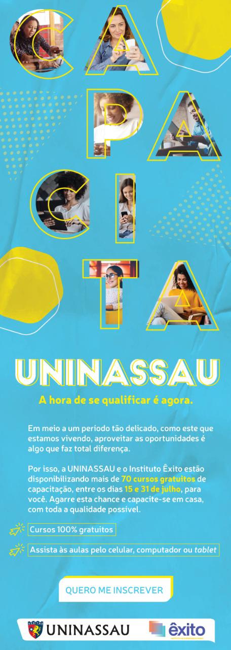 O grupo Ser Educacional mantenedor das marcas UNINASSAU, UNINABUCO, UNIVERITAS, UNG, UNAMA e UniNorte, em parceria com o Instituto Êxito, sabendo da importância da qualificação para o mercado de trabalho, promove a partir do dia 15 de julho o projeto Capacita. A ação visa proporcionar capacitação rápida e gratuita para a população, favorecendo, além do indivíduo, as economias locais. Os interessados podem se inscrever através do https://eventos.sereduc.com/cursoss