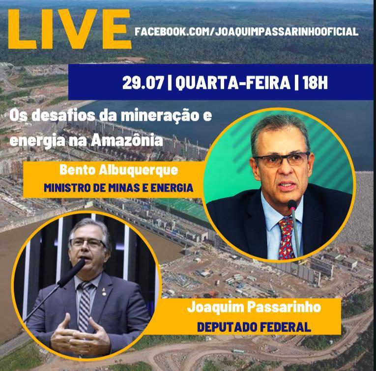 Nesta quarta, 29/7, em live estratégica Joaquim Passarinho, Deputado Federal, vai discutir com o Ministro de Minas e Energia Bento Albuquerque temas importantes.