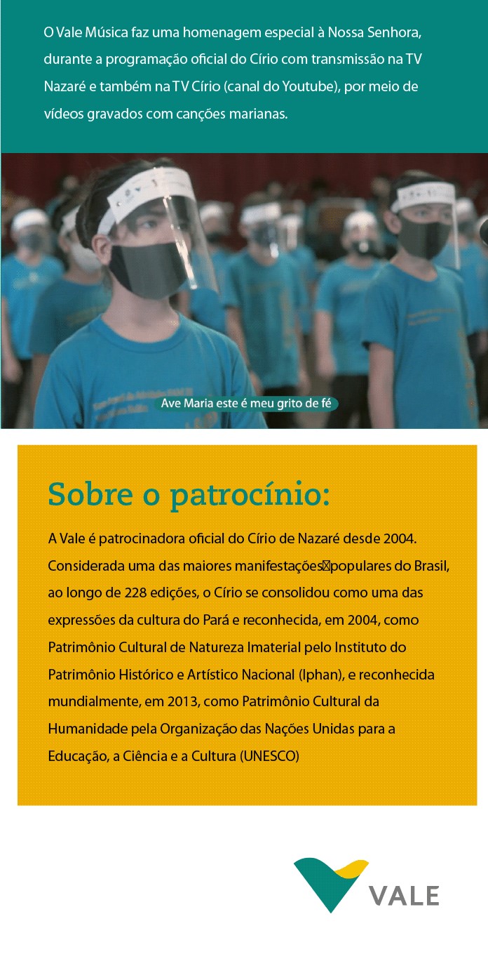 Com objetivo de trazer mais conectividade e interação para esta edição virtual do Círio, a empresa hospedou em seu site uma página especial sobre o Círio (www.vale.com/círio). O canal já está no ar e reúne seções temáticas aos usuários que visitarem o espaço.