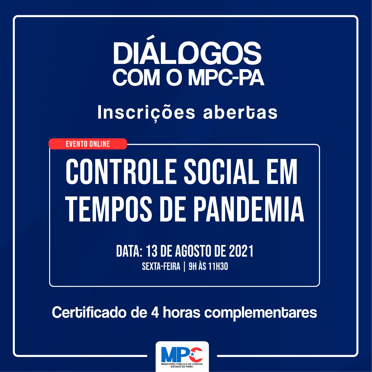 As inscrições para o Diálogos com o MPC-PA são gratuitas e podem ser realizadas em https://www.even3.com.br/controlesocialmpc2021 . Todos os participantes receberão certificado com carga horária de 4 horas complementares.