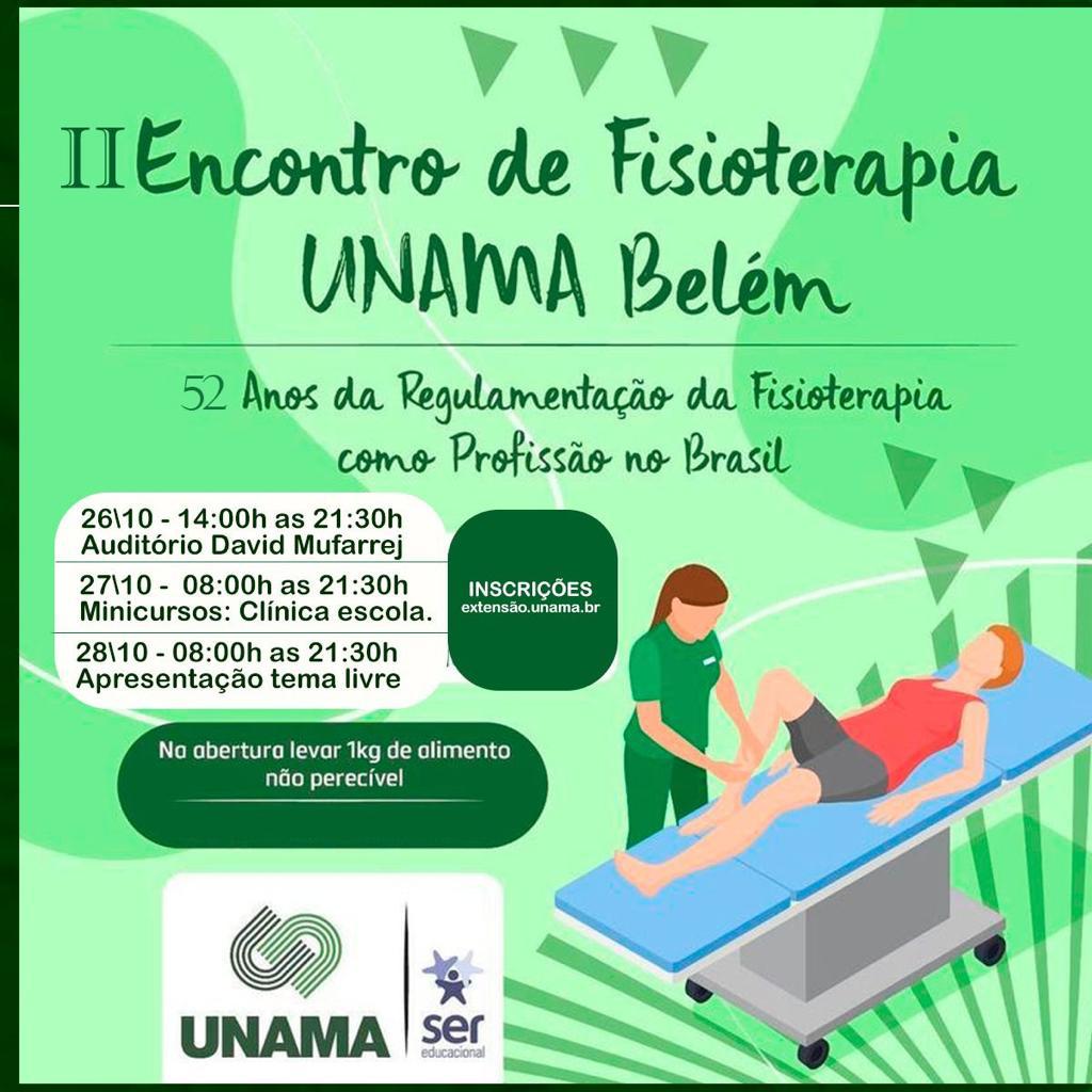 A UNAMA – Universidade da Amazônia desenvolveu uma atividade variada voltada aos docentes, acadêmicos e profissionais, para comemorar os 52 anos da regulamentação da fisioterapia no Brasil. Esta é a segunda edição do Encontro de Fisioterapia. O evento acontece entre os dias 26 e 28 de outubro, no campus Alcindo Cacela.