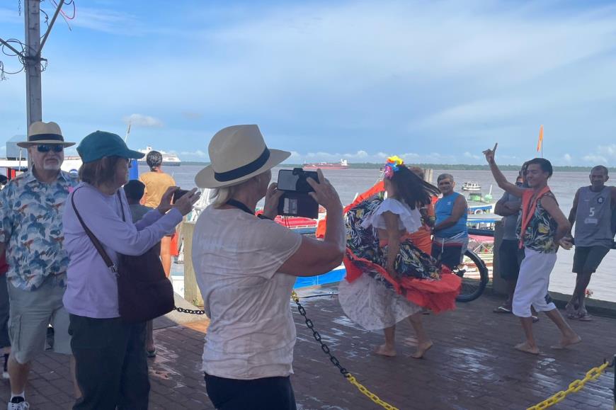 Durante a recepção, os turistas puderam acompanhar a apresentação de um grupo folclórico de carimbó, entrega de materiais promocionais, tiveram acesso ao mapa turístico de Belém Digita com atendimento bilíngue e a um Centro de Atendimento ao Turista itinerante (CAT), no trapiche local.