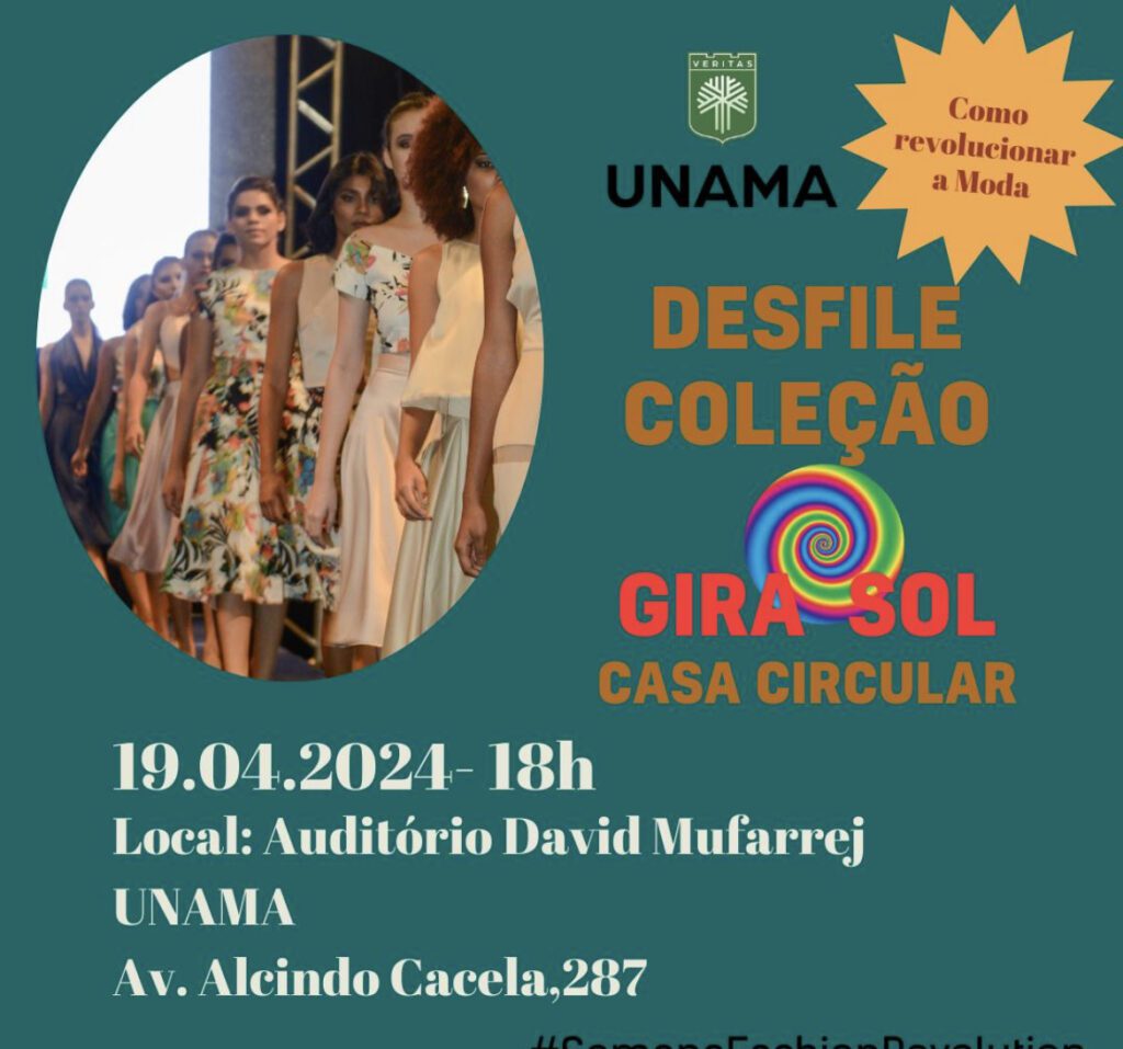 O encontro acontece no auditório David Muffarej. Haverá, ainda, um desfile da coleção “Gira Sol”, da Casa Circular, com curadoria e backstage dos alunos da graduação. Confira as demais programações: 21/04 – 9h: Brechó Solidário (Praça da República); 22/04 – 8h30: Oficina de Ecobags (Laboratório do Moda); 23/04 – 9h: Oficina de Bordado à Mão Livre (Laboratório do Moda); 24/04 – 10h: Apresentação da Bandeira do Fashion Revolution 2024 (Hall de entrada da UNAMA Alcindo Cacela).