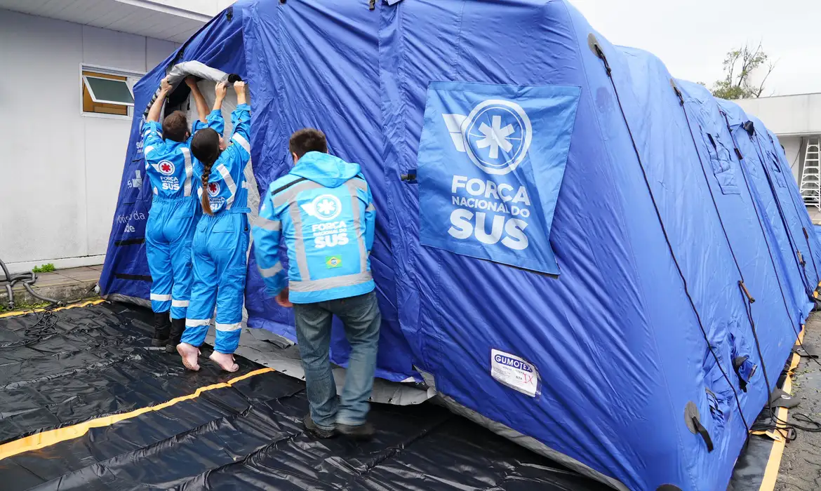 O estado conta com um hospital de campanha em Canoas, que já registrou 1.176 atendimentos. Um está em fase de montagem em São Leopoldo e outro será instalado no Rio Grande do Sul. A cidade ainda está em definição, conforme o ministério. Os hospitais têm