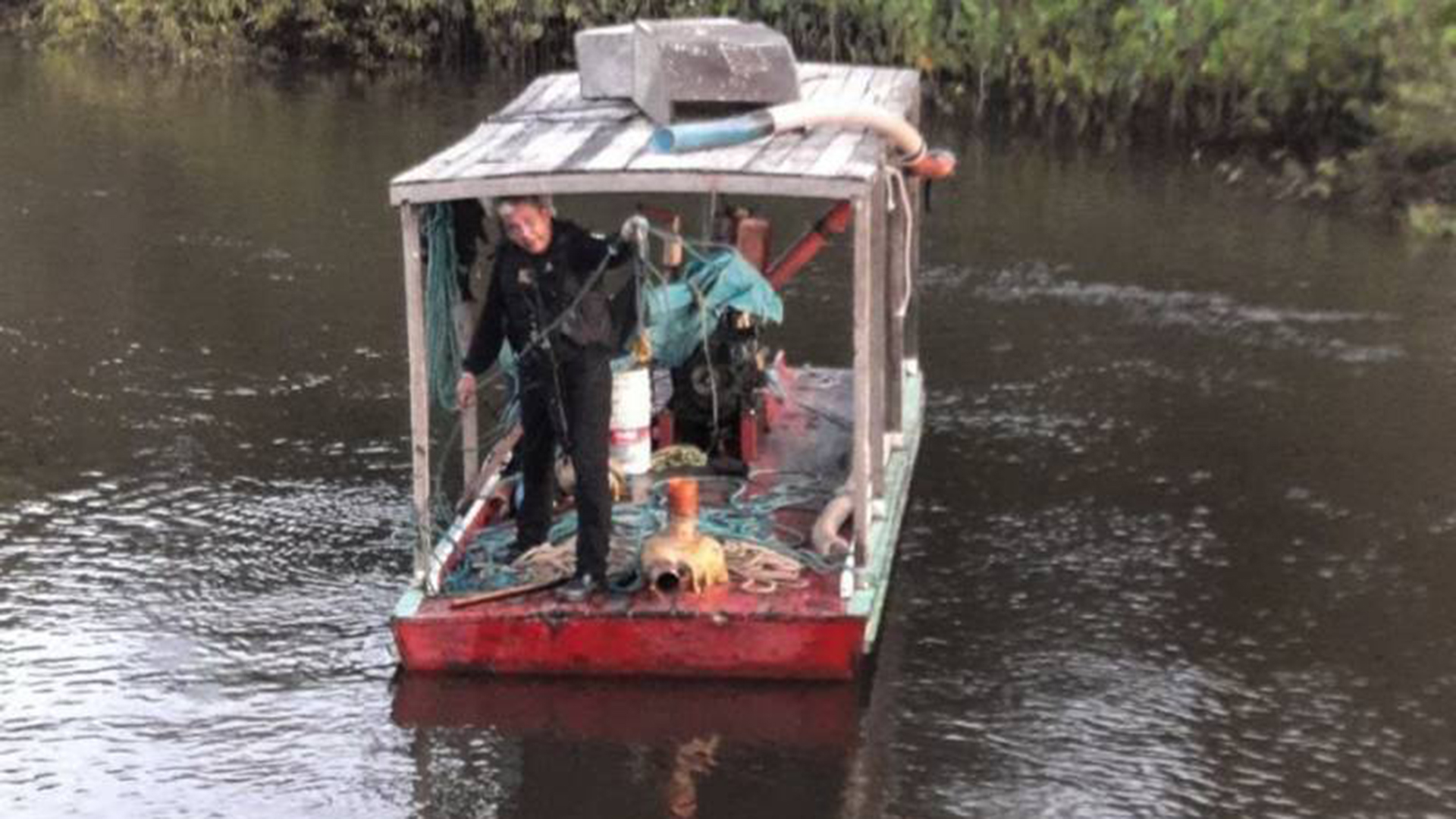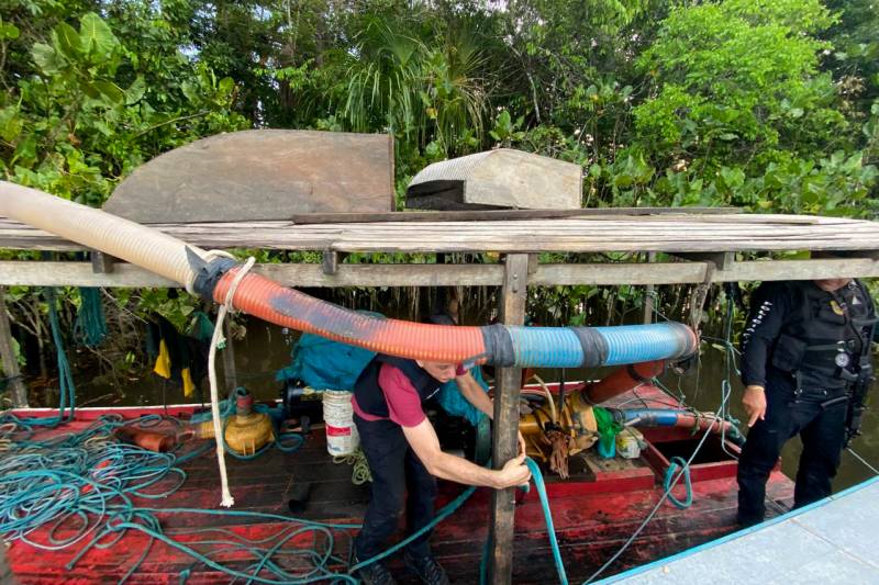 A Operação resultou na descoberta da embarcação de madeira utilizada como draga e do barco de 16 metros de comprimento com capacidade de armazenamento para aproximadamente 20 toneladas