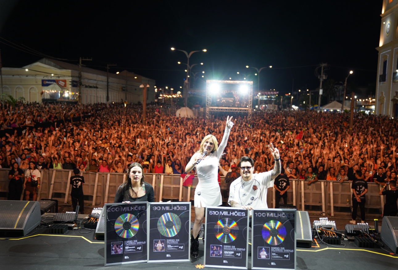 Manu Bahtidão foi surpreendida por sua equipe durante o show em Aracati/CE com a entrega de quatro discos certificados pelo Pró Música. Fenômeno em todo o país, a cantora recebeu no palco, na frente de milhares de pessoas, quatro certificados: um de Diamante Triplo, dois de Platino Duplo e um Platina, reafirmando ainda mais seu sucesso, que conquistou o Brasil.