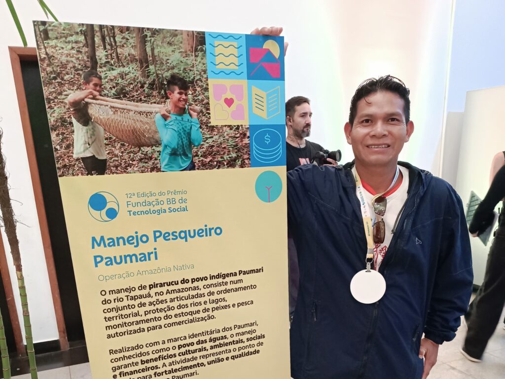 Entre 1.112 iniciativas inscritas de todo o Brasil, o manejo sustentável de pirarucu feito pelo povo Paumari, do Amazonas, foi uma das vinte premiadas na 12ª edição do Prêmio Fundação BB de Tecnologia Social. A premiação aconteceu no dia 21 de junho, em Brasília (DF), e celebrou realizações inovadoras nas áreas de alimentação, educação, energia, renda, habitação, meio ambiente, água e saúde. Os vencedores serão contemplados com recursos financeiros para investimento em projetos de reaplicação das tecnologias sociais.