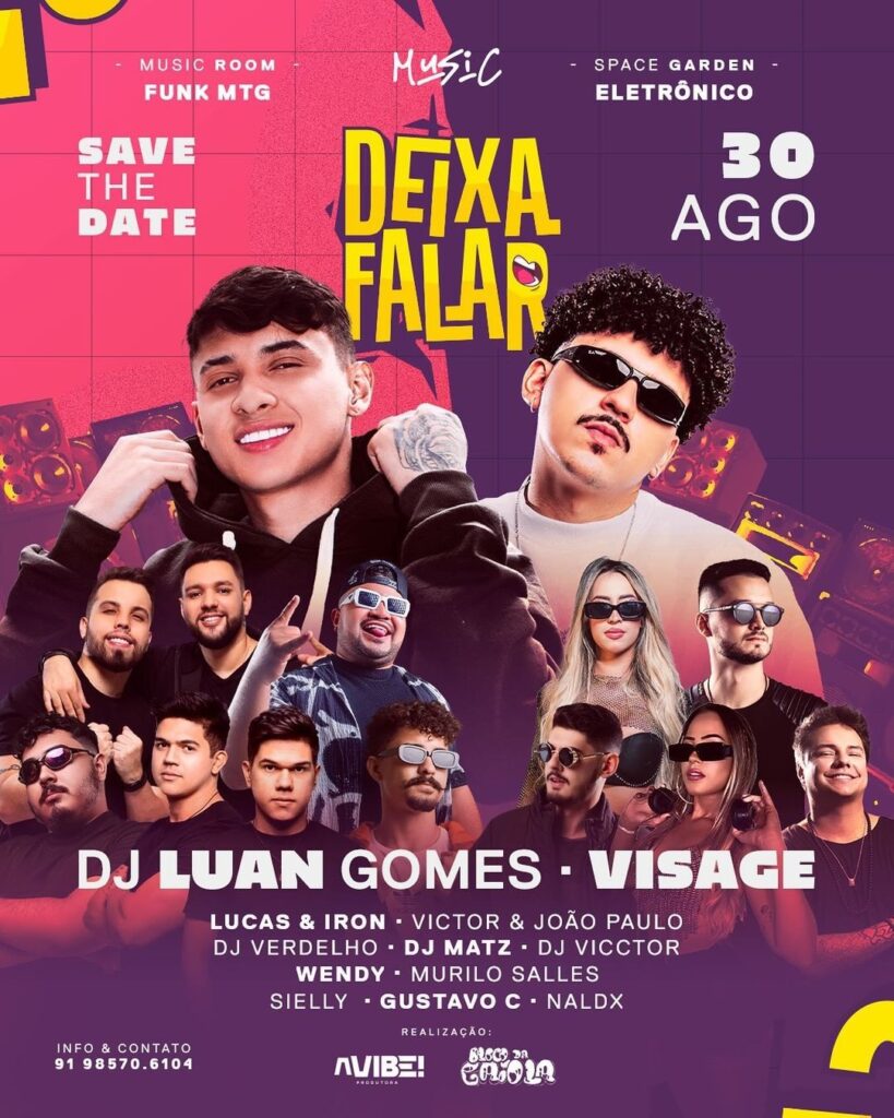 Serviço: Festa “Deixa Falar” com as atrações nacionais DJs Luan Gomes e Visage Music, nesta sexta-feira (30), a partir das 22h, no Music Park, bairro Reduto, em Belém. Infos: (91) 98570-6104 e Bilheteria Digital.