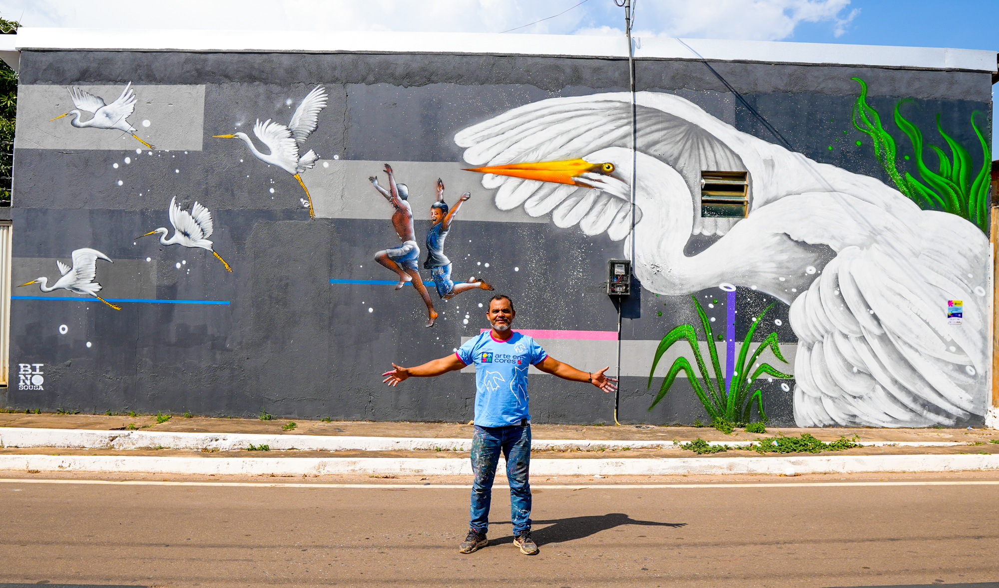 Entre os selecionados para o painel coletivo está o artista Bino Sousa. Em seu trabalho individual durante a primeira fase do Arte em Cores, Bino transformou um simples muro cinza de uma casa em uma obra de arte. O muro fica no bairro Novo Horizonte, no Núcleo Cidade Nova, em Marabá. Chamado de “Voos de Rio”, a pintura gigante remete à natureza e à conexão das crianças com o banho de rio. “Sou muito ligado aos rios Itacaiúnas e Tocantins, que banham Marabá. Gosto desse contato com a natureza. Minha arte revela essa paixão que tenho pelos rios e pela conexão entre homem e natureza. Sempre me inspiro nessa minha paixão e minha arte revela esse amor”, afirmou Bino, que é já veterano no projeto.