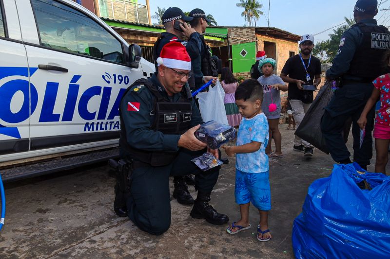 Pelo terceiro ano consecutivo, a Polícia Militar do Pará promoveu o Natal Solidário para centenas de crianças da Região Metropolitana de Belém, nesta segunda-feira (23). A ação mobilizou todo o efetivo da corporação que, de forma voluntária, presenteou com brinquedos meninos e meninas em situação de vulnerabilidade social, que moram em áreas próximas às sedes dos Comandos de Policiamento. Os brinquedos foram arrecadados ao longo das últimas semanas pelos próprios agentes e demais servidores da PM do Pará.