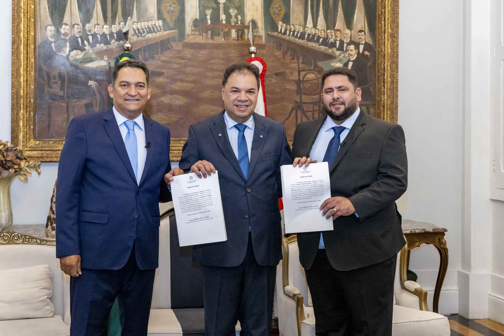 Nesta quinta-feira (2) o presidente da Assembleia Legislativa do Pará (Alepa), deputado Chicão (MDB), empossou, na sala da presidência, os novos parlamentares que irão ocupar duas das 41 cadeiras do Poder Legislativo Estadual. O agora deputado João Pingarilho (Podemos) assumiu o posto deixado por Toni Cunha, que, por sua vez, assumiu a prefeitura de Marabá. Já o deputado Torrinho Torres (MDB) retornará à Alepa no lugar de Igor Normando que deixou o cargo para administrar a cidade de Belém.