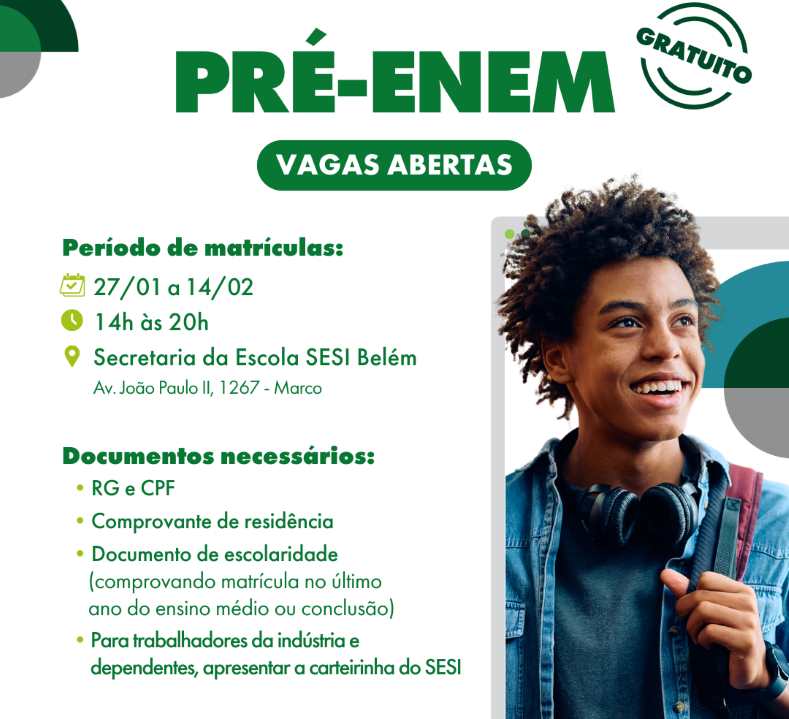 Com o objetivo de apoiar estudantes na preparação para o Exame Nacional do Ensino Médio (Enem), o Serviço Social da Indústria – SESI Pará está com inscrições abertas para seu curso pré-Enem gratuito.