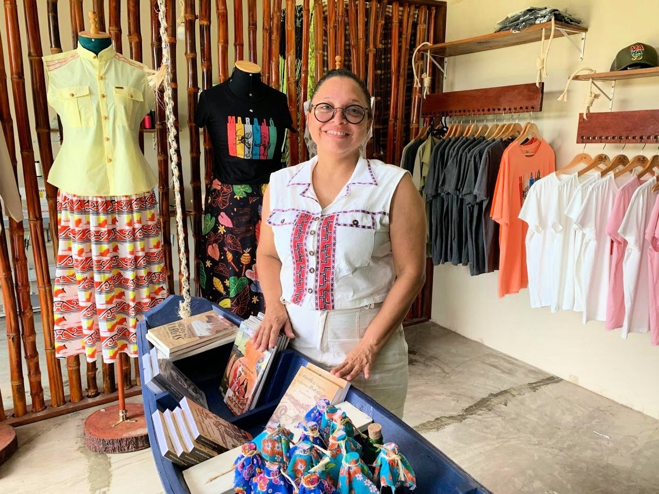 “É uma pessoa muito dedicada; tudo que ela aprende, aplica. Busca fazer melhorias sempre. Ela desenvolveu sua própria marca, suas próprias ilustrações, e agora, em dezembro, conseguiu inaugurar sua própria loja, com toda sua identidade além de produzir peças autorais. Se configura como uma marca forte aqui no Marajó”, Gisele Moreira, analista do Sebrae na região.