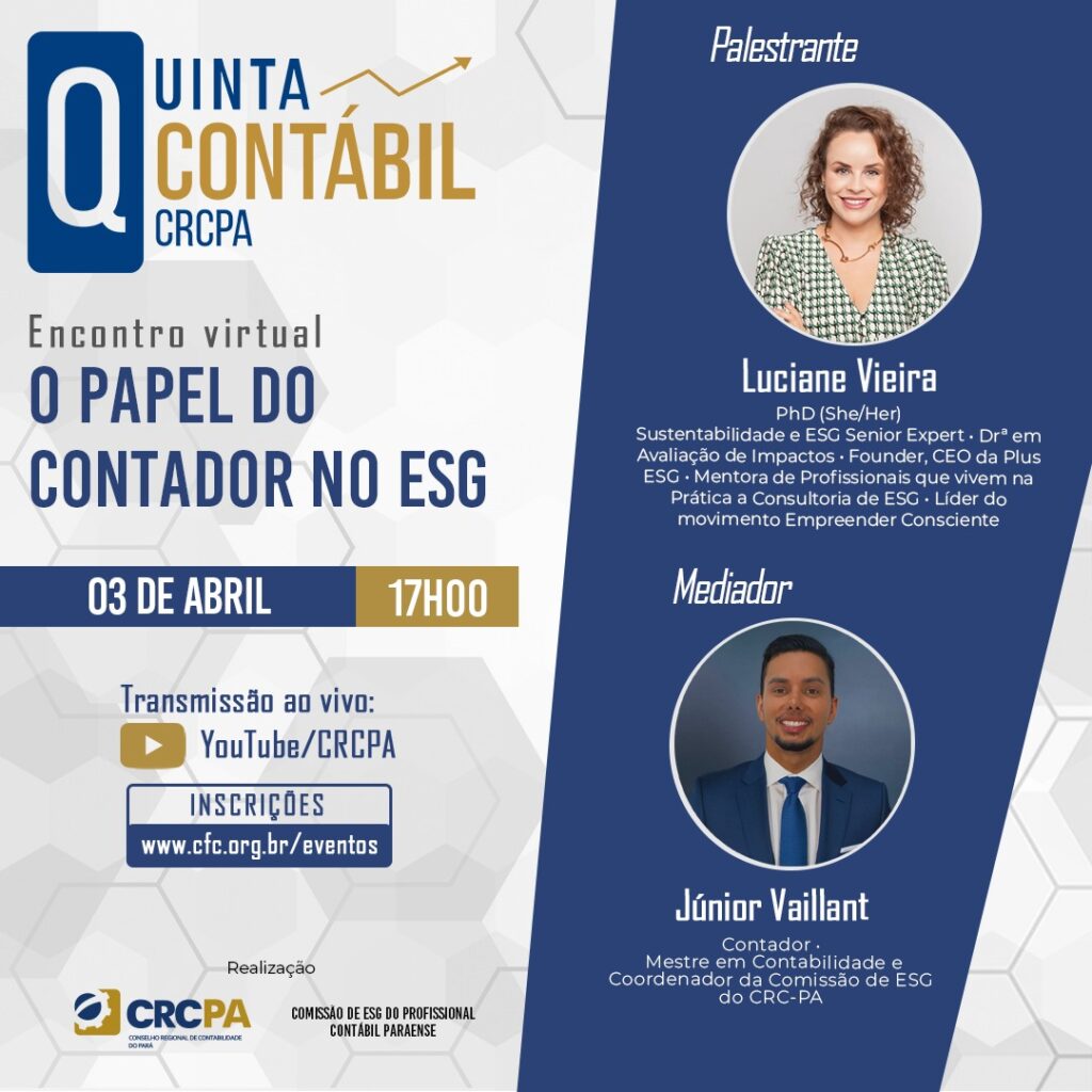 No aquecimento para a COP30, que ocorrerá em Belém em novembro, o Conselho Regional de Contabilidade do Estado do Pará (CRC-PA) convidou a doutora nas áreas de Sustentabilidade e Avaliação de Impactos, Luciane Vieira, para ministrar uma palestra sobre “O papel do contador no ESG”. O evento faz parte do projeto Quinta Contábil e será transmitido no dia 03 de abril (quinta-feira), às 17h, pelo canal do CRC-PA no Youtube.