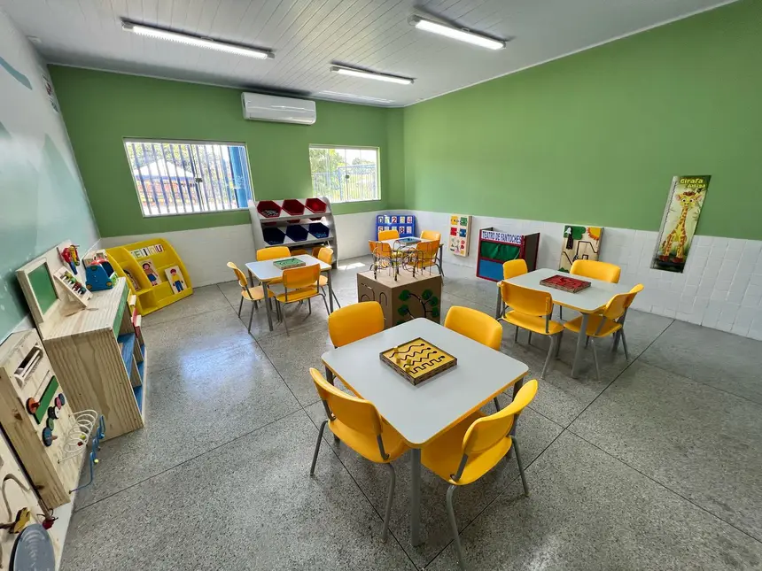A unidade de educação infantil tem 9 salas de aula, 1 sala multiuso, 5 banheiros, lactário, berçário, trocador, jardim, espaço de convivência, parquinho em areia, cozinha, bloco administrativo, entre outros espaços totalmente equipados e adaptados.