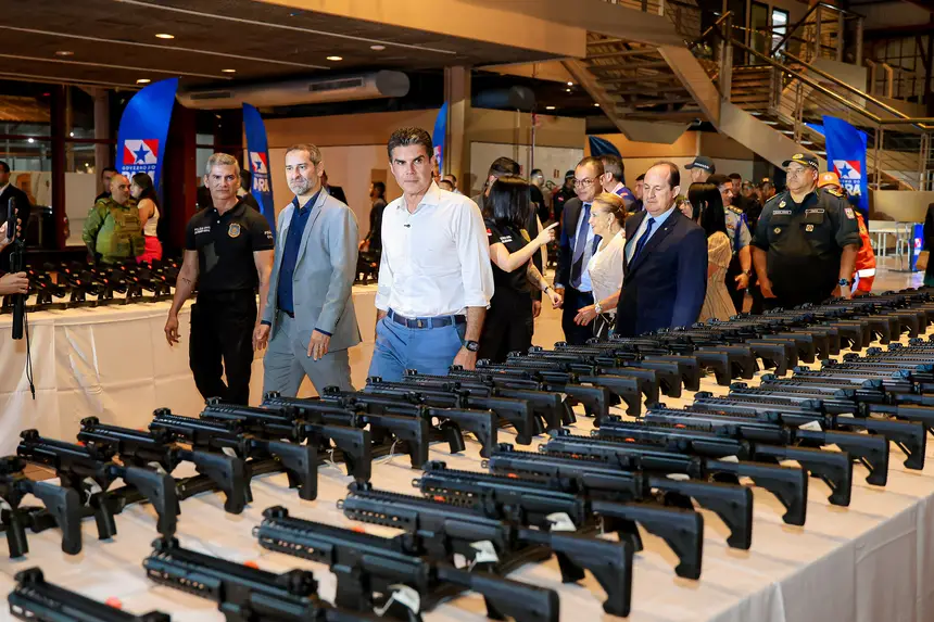 Hoje a segurança pública do Pará recebeu submetralhadoras, trajes antibomba, maletas para perícias papiloscópica e local de crime, raio-x portátil, magnificadores ópticos, lasers e uma viatura policial