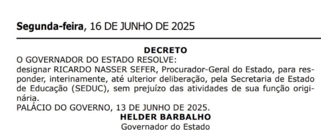 Em decreto publicado, nesta segunda-feia,16 de junho, o governador do Pará Helder Barbalho (MDB) designou, o procurador-geral do Estado, Ricardo Nasser Sefer, para responder interinamente pela Secretaria de Estado de Educação (Seduc).