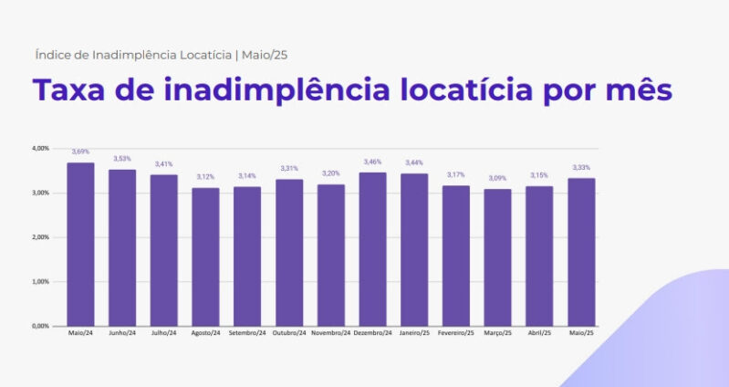 A taxa de inadimplência de aluguel no Brasil bateu o segundo mês seguido de alta, fechando em 3,33% em maio, após atingir 3,15% em abril, com variação de 0,18 ponto percentual. Quando comparado com o mesmo período de 2024 (3,69%), a taxa de inadimplência apresenta uma retração de 0,36 ponto percentual. A taxa de maio é a segunda maior de 2025, após o pico do ano em janeiro (3,44%). Os dados são do Índice de Inadimplência Locatícia da Superlógica, principal plataforma de soluções tecnológicas e financeiras para os mercados condominial e imobiliário no país.