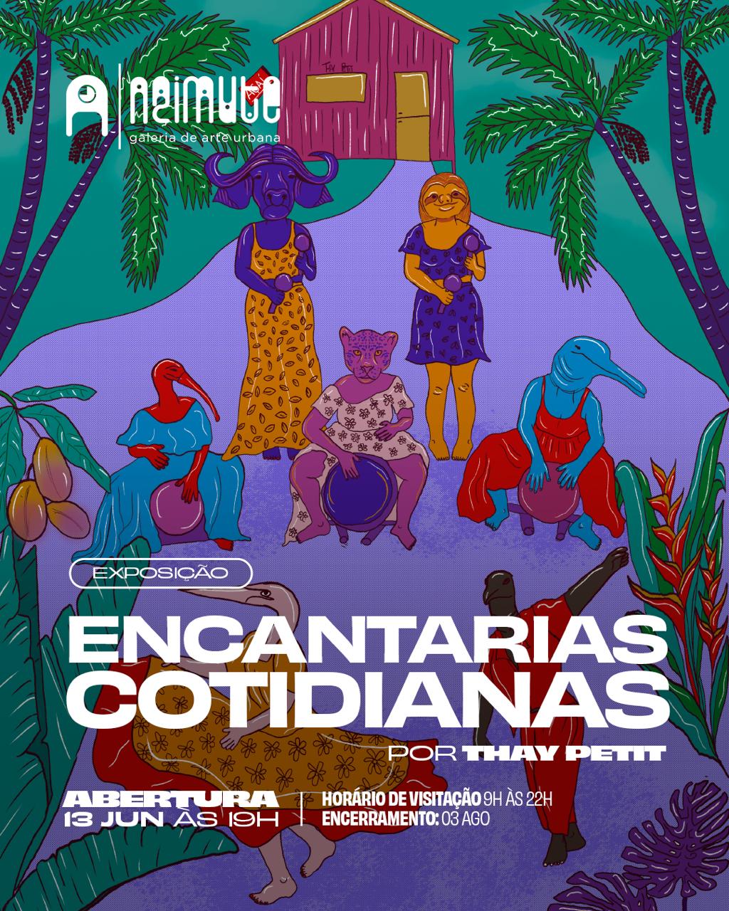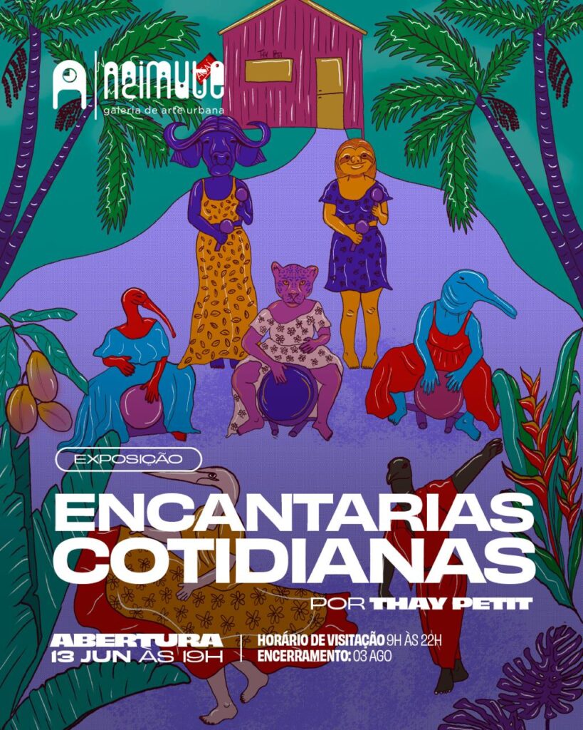 Um urubu catando manga, uma roda de carimbó onde os artistas são um boto e uma búfala. Atravessando universos sensíveis e cotidianos da Amazônia, Thay Petit, artista carioca radicada em Ananindeua, revela complexas relações entre seres, tempo e território, sempre permeado por cores vibrantes e composições envolventes. Esta é a proposta da exposição “Encantarias Cotidianas”, aberta para visitação do público na Galeria Azimute até dia 03 de agosto, em Belém.
