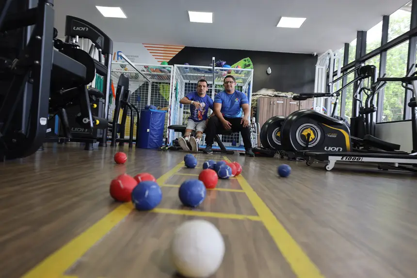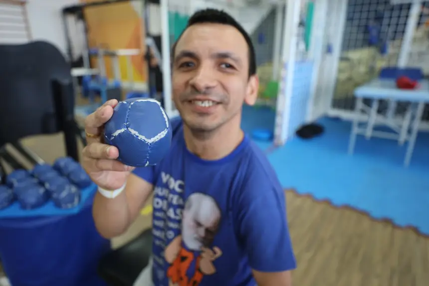Alesson Ribeiro, 35 anos, usuário com paralisia cerebral, é um dos 40 participantes das turmas de esportes adaptados. Há dois anos, os profissionais do CIIR encontraram na bocha uma oportunidade de estimular o tônus muscular, o equilíbrio corporal, o controle de tronco, a coordenação motora e a noção espacial de Alesson.