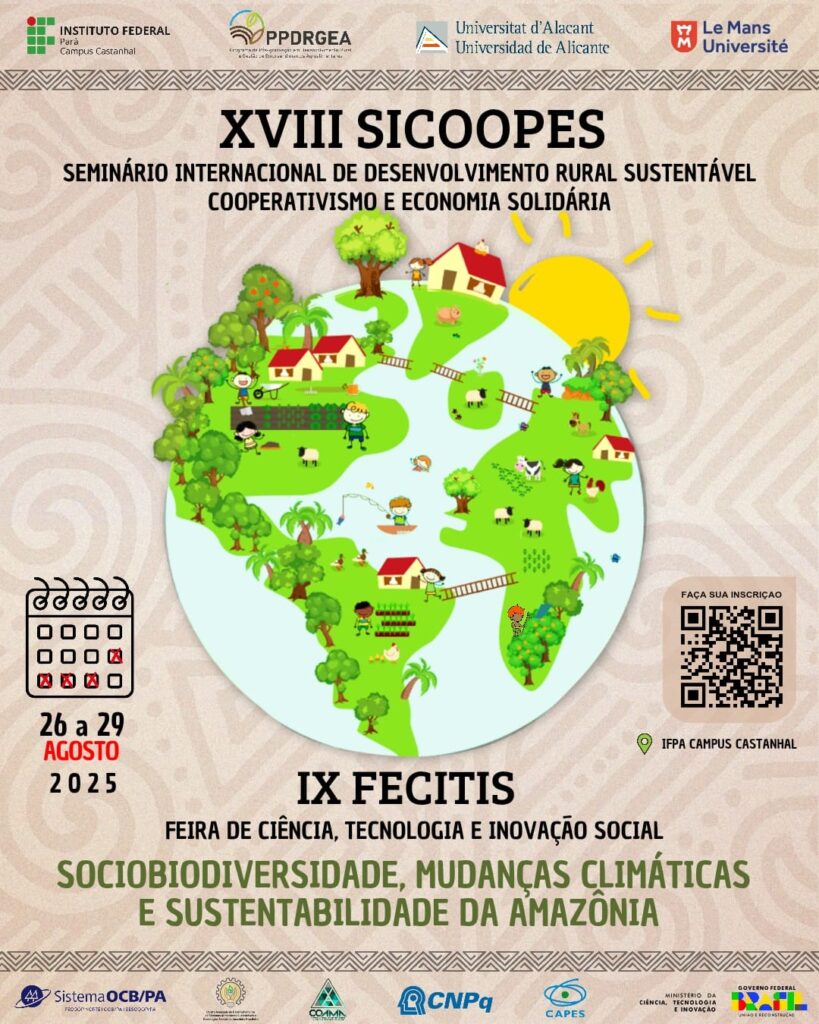 Em sua 18ª edição, o Seminário Internacional de Desenvolvimento Rural Sustentável, Cooperativismo e Economia Solidária (SICOOPES) e a 9ª Feira de Ciência, Tecnologia e Inovação Social (FECITIS) reafirmam seu papel como espaços de referência no debate sobre cooperativismo, economia solidária e inovação na Amazônia. Organizado pelo Programa de Pós-Graduação em Desenvolvimento Rural e Gestão de Empreendimentos Agroalimentares (PPDRGEA) do IFPA Castanhal, em parceria internacional com a Universidad de Alicante (Espanha) e Le Mans Université (França), o evento conta pelo décimo ano consecutivo com o apoio institucional do Sistema OCB/PA, fortalecendo a conexão entre a produção científica e o desenvolvimento do cooperativismo no território paraense.