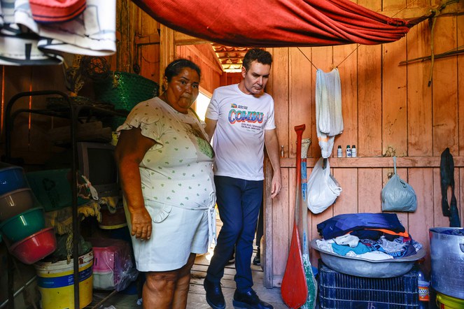 Durante a agenda na Ilha do Combu, o ministro Jader Filho visitou a moradia de uma das beneficiadas com as novas casas destinadas à região. Ângela Maria Soares, de 60 anos, vive em uma palafita no Furo da Paciência. A casa, em condições precárias, é severamente afetada pelas cheias do rio, que já chegou a destruir parte do assoalho e provocar danos irreparáveis a móveis e eletrodomésticos.