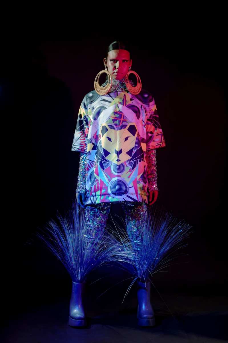 Na mostra, moda, arte e tecnologia se cruzam para criar novas imagens da Amazônia: festivas, potentes e reimaginadas. O tecnobrega, conhecido por sua fusão de ritmos eletrônicos e influências regionais, emerge como um movimento artístico plástico visual crucial sob a visão do ribeirinho futurista. As aparelhagens em questão não são apenas instrumentos de entretenimento, são manifestações tangíveis da resiliência e criatividade das comunidades ribeirinhas.