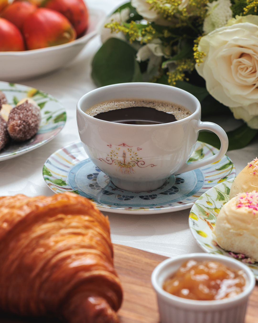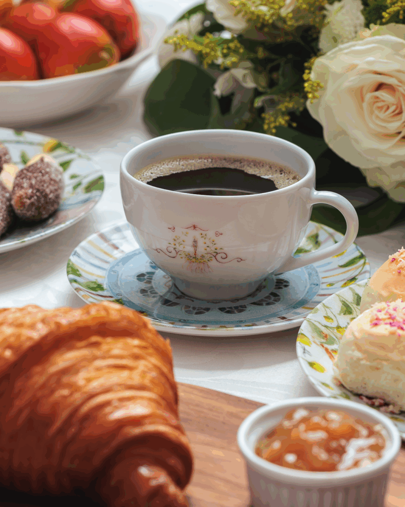 A xícara e o pires trazem arabescos da porta lateral do Ver-o-Peso, fitinhas coloridas e a imagem da Santa estampada com flores de jambu — um amarelo vibrante, característico da região. Já os pratos rasos retratam a procissão do Círio, a Cidade Velha, a Sé, a Basílica e a Praça do Relógio, além do Círio Fluvial e de pontos icônicos como o Palacete Faciola e o Bar do Parque. Enquanto o prato fundo é dedicado às promessas e aos promesseiros, além de representar o Círio Fluvial, reforçando o elo da festa com a fé popular.