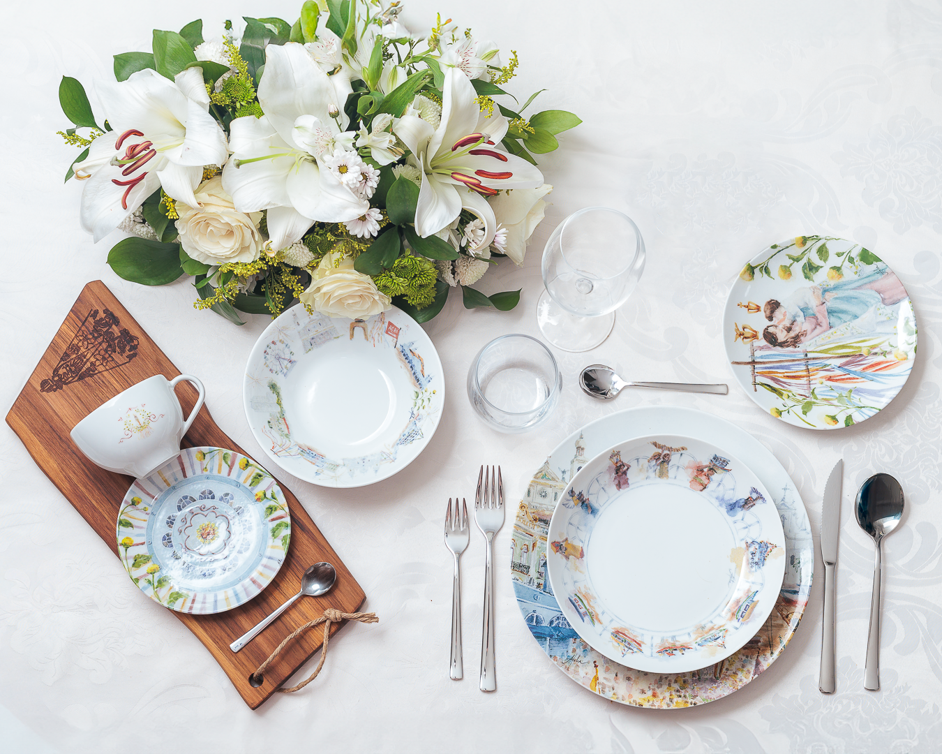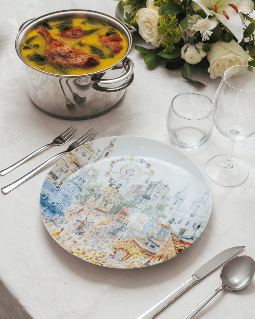 O prato de sobremesa destaca a Santa em diferentes momentos: ora envolta pelo manto de flores de jambu, ora em sua berlinda, passando pela esquina do Ver-o-Peso em uma das passagens mais emocionantes da procissão. Já a tigela reúne monumentos do percurso do Círio, além de elementos como as plaquinhas de açaí, as fitinhas coloridas, barquinhos do Círio Fluvial e fogos de artifício. A tábua, por sua vez, traz a imagem da Santa de maneira mais sutil.