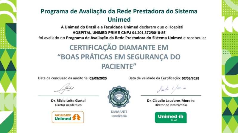 A Diretoria Administrativa da Unimed comunicou aos sócios cooperados a recente premiação recebida pelo Hospital Unimed Prime, que foi agraciado com a Certificação “DIAMANTE EM BOAS PRÁTICAS EM SEGURANÇA DO PACIENTE”.