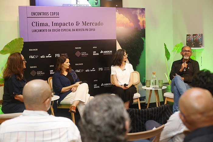 Aberje, Victor Pereira, que ressaltou a importância do debate sobre a forma como se comunicar tema tão complexo como as mudanças climáticas e COP30; e Kelly Lima, sócia-fundadora da Alter Conteúdo, uma das agências que criaram a Casa Balaio, para quem a pauta do clima demorou a chegar: “Me encantou a possibilidade de não só falar dessa tragédia do clima, mas falar de sugestões, amplificar essas vozes”.