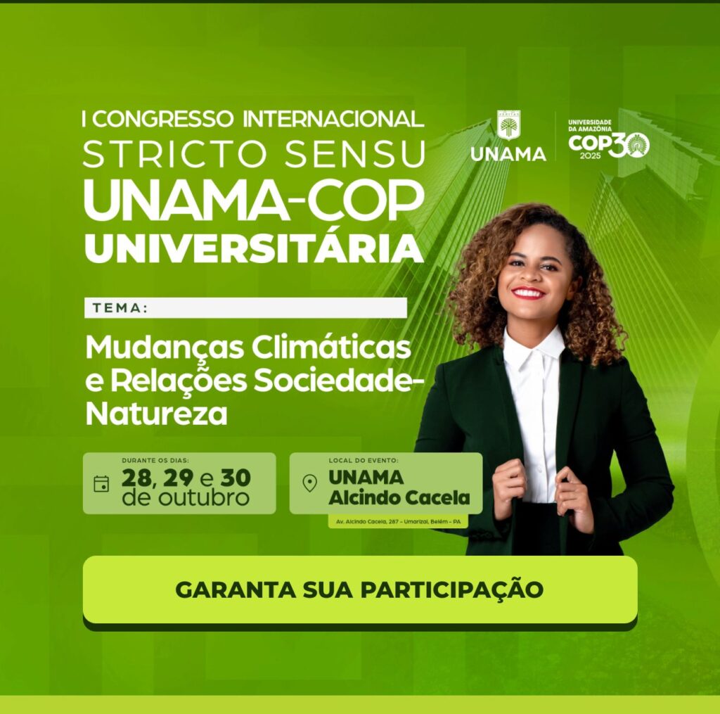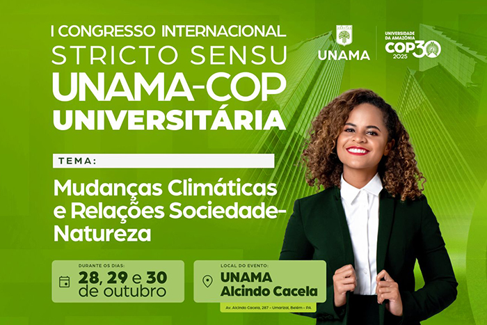 A UNAMA – Universidade da Amazônia promove, nesta terça-feira (28), o I Congresso Internacional Stricto Sensu. O tema central discute as “Mudanças Climáticas e Relações Sociedade-Natureza”. A abertura será às 15h, no Auditório David Mufarrej, campus Alcindo Cacela. O evento é aberto ao público e vai até 30 de outubro.