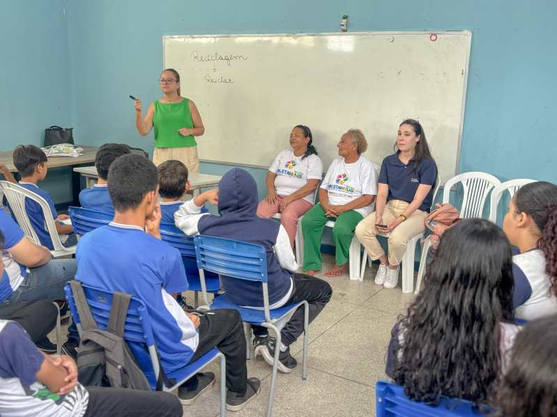 O evento faz parte do programa Negócios Coop que capacita as cooperativas de reciclagem para atuar com excelência na COP30, que será realizada em novembro, em Belém. Durante a atividade, cooperados das cooperativas CONCAVES, ACCSB e Filhos do Sol, compartilharam com estudantes e professores experiências reais sobre como o cooperativismo transforma resíduos em oportunidades sustentáveis.