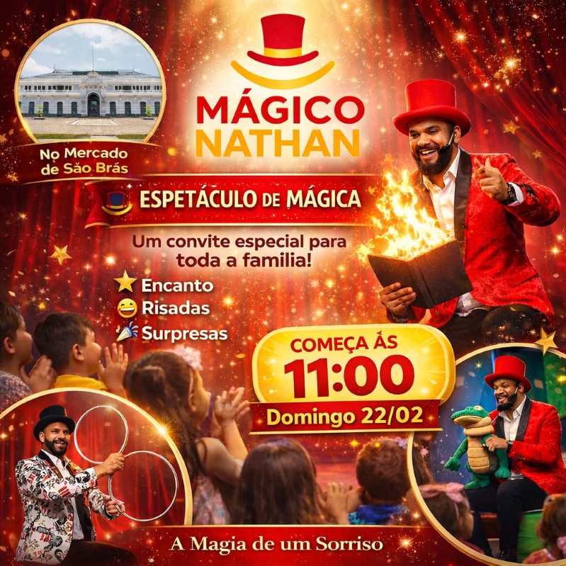 Neste domingo, 22, às 11h, o mágico Nathan chega trazendo um espetáculo cheio de encanto, interação e muitas surpresas para a criançada — e para os adultos também.
