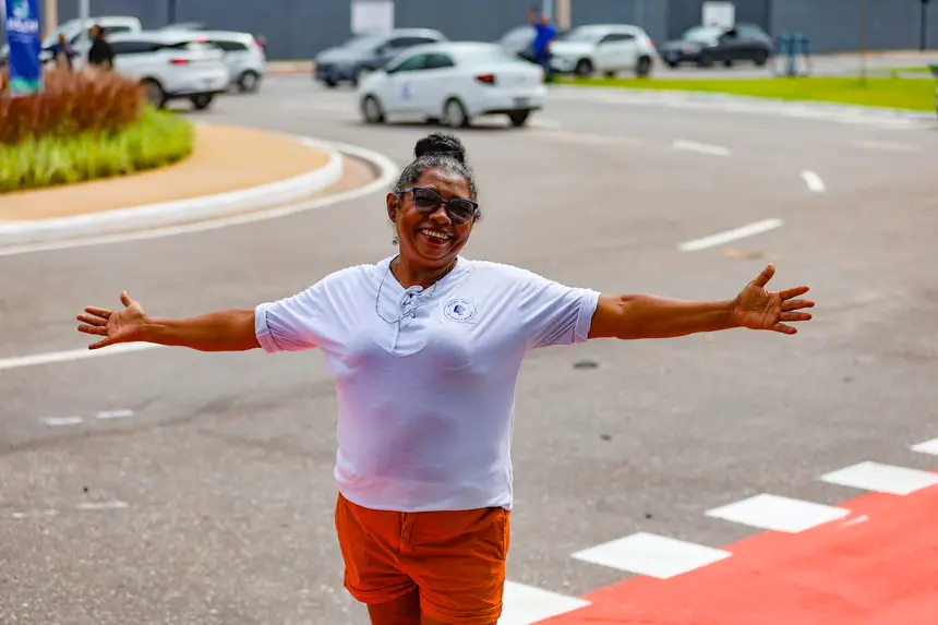 Maria Costa abre os braços e o sorriso de satisfação pela transformação implementada pelo Governo do Pará na via – Foto: Bruno Cruz / Ag. Pará
