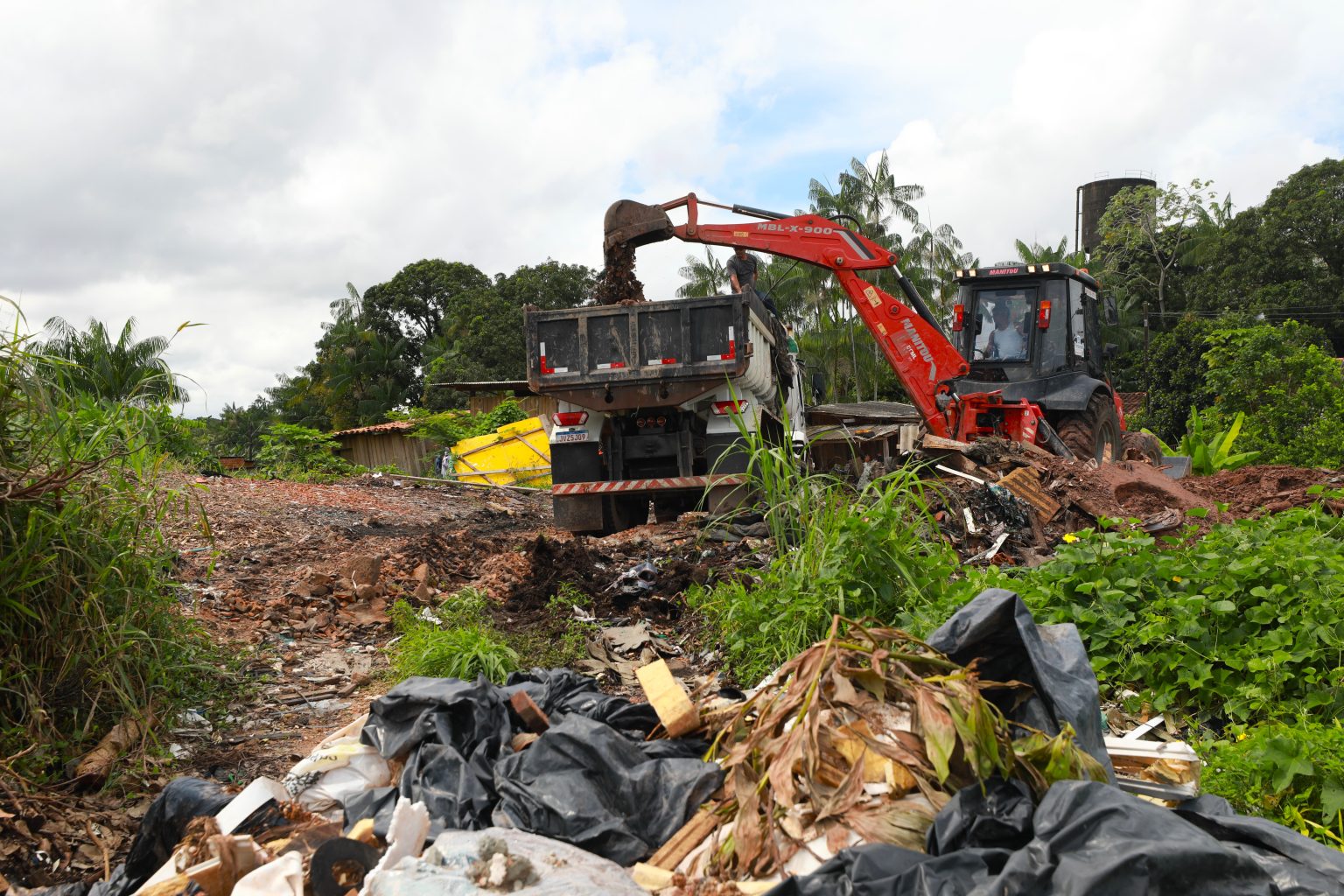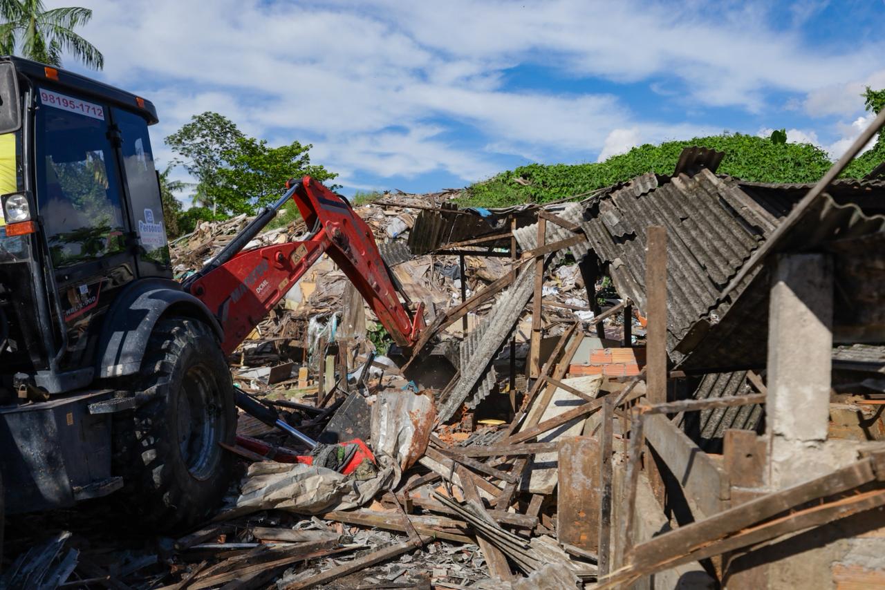 Enquanto a demolição avançava, outra frente de trabalho seguia ativa nas proximidades do canal. Equipes montaram uma força-tarefa para a limpeza de um lixão irregular de grandes proporções. A ação ocorreu ao longo da última semana, com retirada contínua de resíduos, como parte das medidas para reduzir os impactos das chuvas.